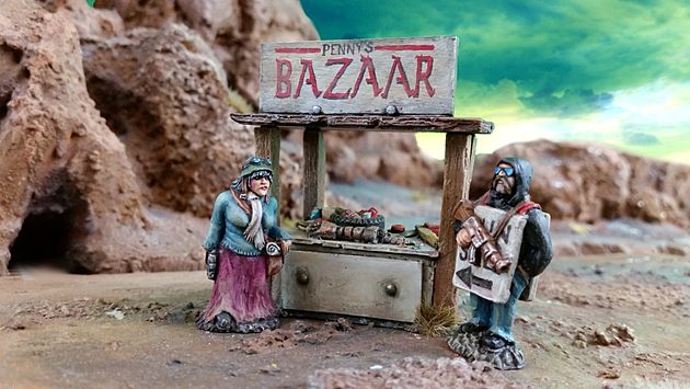 This set contains a trade stall, merchant and guard all cast in high quality resin and supplied unpainted and unassembled.