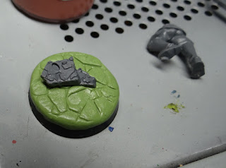 To keep him different from the rest of the grunts, which will continue to get sand bases as I have done previously, I used my Imperial Basius pad to create a textured layer, then pushed the scenic piece into the top of it. At this point, I also pressed the Commissar's foot into the greenstuff/Milliput mix to keep a consistency with the footing, as seen above.